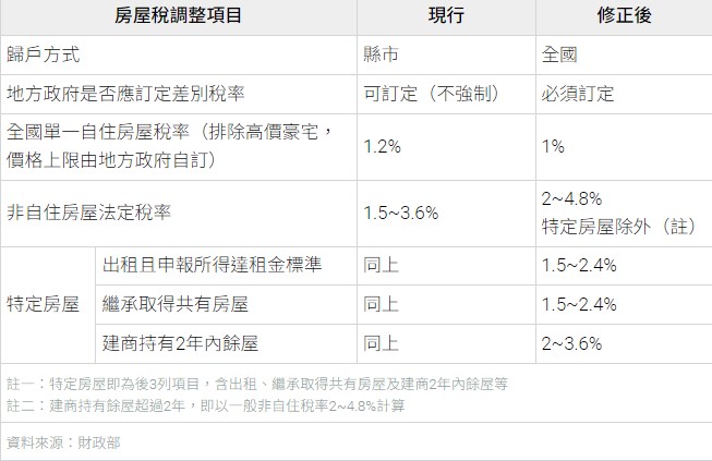 新制也規定,若全國只擁有一戶自住房屋的家庭,房屋稅自用稅率便可從1.2%再降到1%。