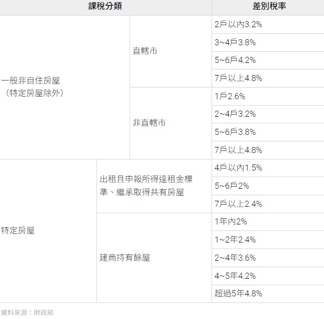 此外,非自住房屋稅率區間從1.5~3.6%,提高到2~4.8%。為了鼓勵多屋族出租,以及避免多人持分遺產被視為囤房的爭議,這兩類非自住房屋享有較低的1.5~2.4%稅率。