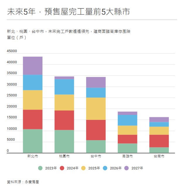 尤其在新北、桃園、台中市,未來3年完工戶數遙遙領先其他縣市,位在這3個縣市的建商勢必將面臨更高的庫存風險。