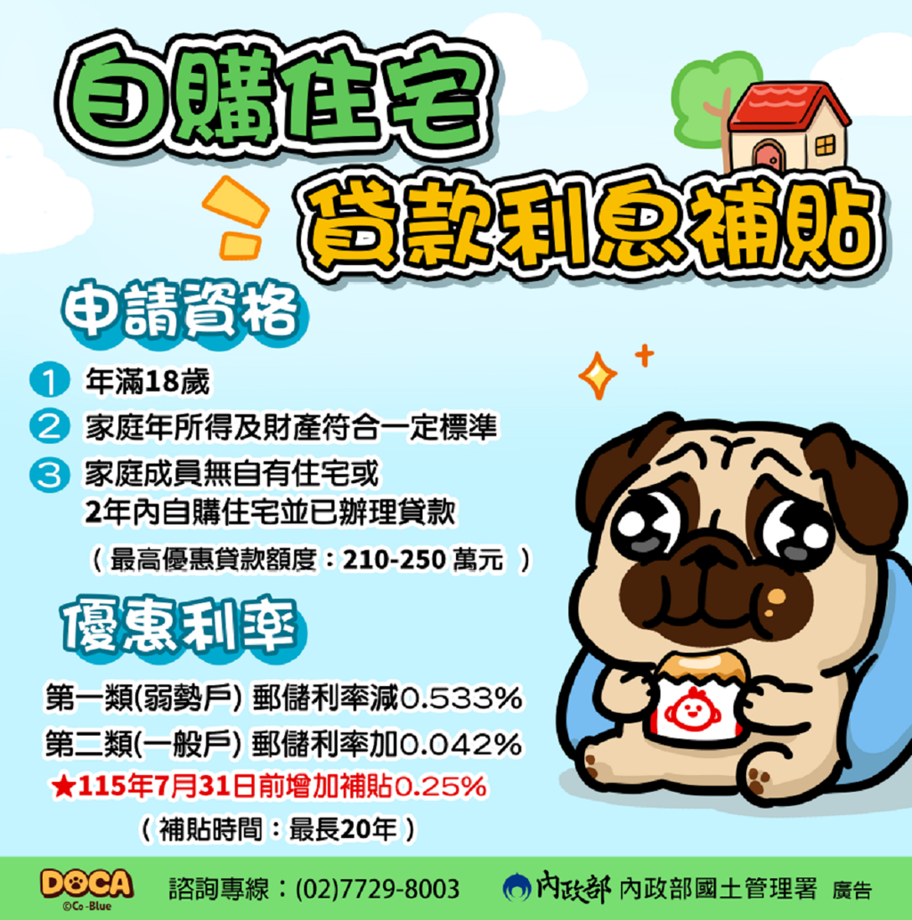 屬於弱勢對象的第⼀類,補貼額度的房貸利率可享郵儲利率減0.533%,⽬前為1.187%,因115年7⽉31⽇前增加補貼0.25%,降為0.937%。屬於第⼆類⼀般對象,補貼額度的房貸利率為郵儲利率加0.042%,⽬前為1.762%,115年7⽉31⽇前增加補貼0.25%,降為1.512%。