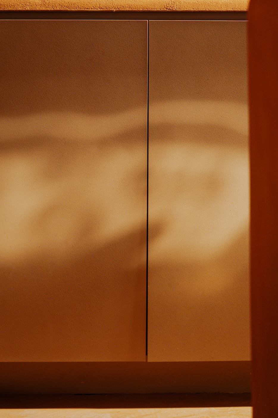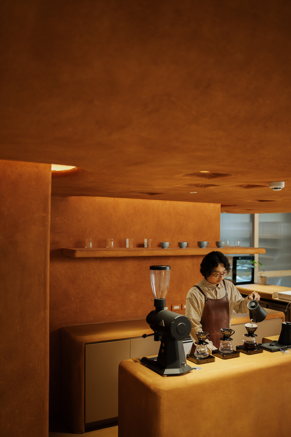 「土壤中充滿養分與多樣微生物,彼此依存、共生的關係,就如同人與人之間的緊密連結。」紅泥牆經時光變化,成為空間裡一座與人共同呼吸的牆,會出現溫潤質樸的自然深淺色澤,人們宛如從天空觀看大地的洞穴,感受咖啡來自土壤而長出的生命力;同時也呼應 ONIBUS 團隊追求自然永續的精神,代表栽植咖啡的大地,與咖啡液色的本質。