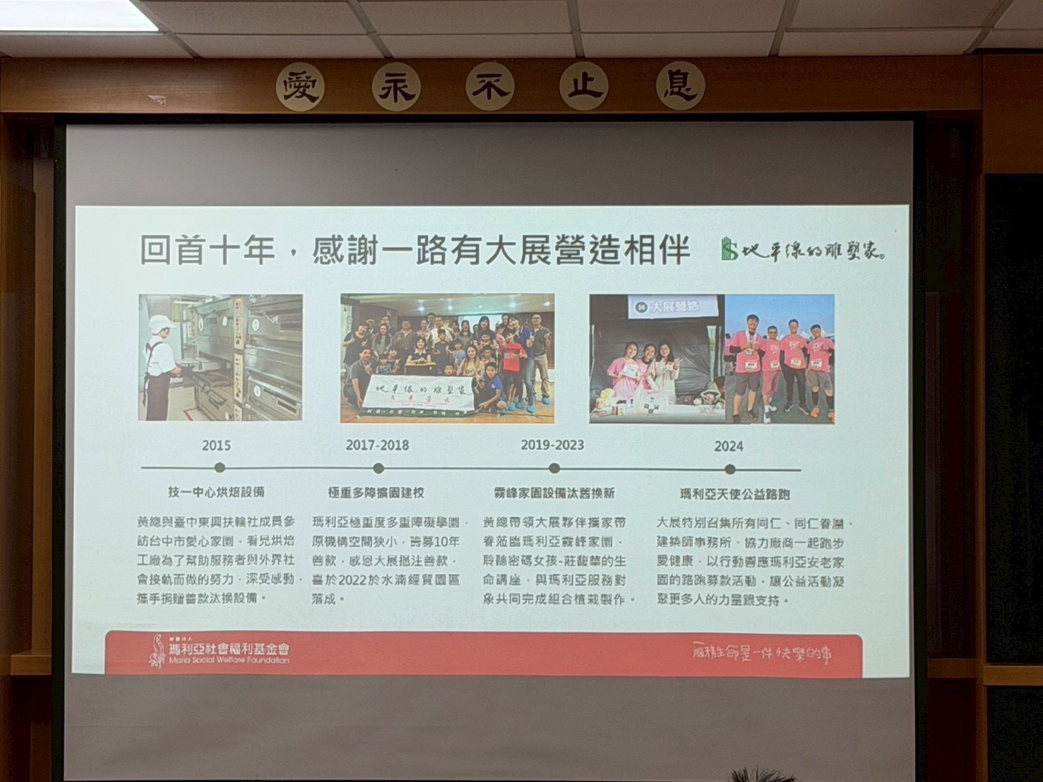 公司邀請同仁攜手孩子走進瑪利亞社會福利基金會-台中愛心家園,透過實地導覽,看見從早療、安老照護到就業培力的完整支持網絡,讓孩子認識多元生命樣貌,學習關懷、尊重與同理。